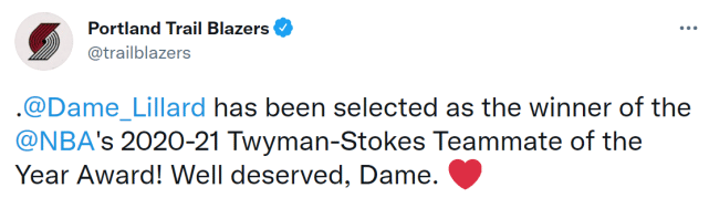 来源:24直播网06-04 16:4724直播网讯讯 北京时间6月4日,NBA官方宣布,开拓者后卫利拉德获得了2020-21赛季的特怀曼-斯托克斯年度最佳队友奖。该奖项设立于2012-13赛季,每年颁发一次,旨在表彰场内场外无私的球员。他们能对球队做出承诺,拥有奉献的精神,起到导师和榜样的作用,被视为最佳队友。