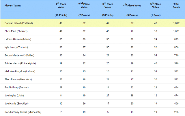 每个球员可以投5个人,按排列顺序分别计为10分、7分、5分、3分和1分。利拉德获得了303张第一选票中的40张,总分1012分,从官方公布的票选结果来看,他算是险胜保罗得到这一奖项。保罗总分是1001分,只比利拉德少11分。保罗得到了47张第一选票,但利拉德在第四选票和第五选票的位置上,明显多于保罗。