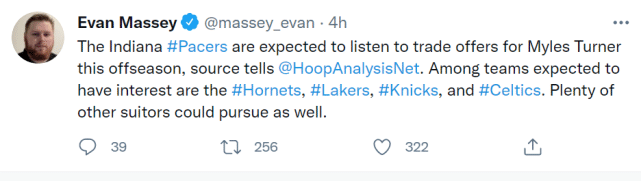 来源:24直播网06-04 16:3924直播网讯讯 北京时间6月4日,据NBA记者Evan Massey报道,印第安纳步行者将在今年休赛期听取关于迈尔斯-特纳的报价,消息源告知,对特纳感兴趣的球队至少包括黄蜂、湖人、尼克斯和凯尔特人,预计有更多的球队会加入特纳争夺战。