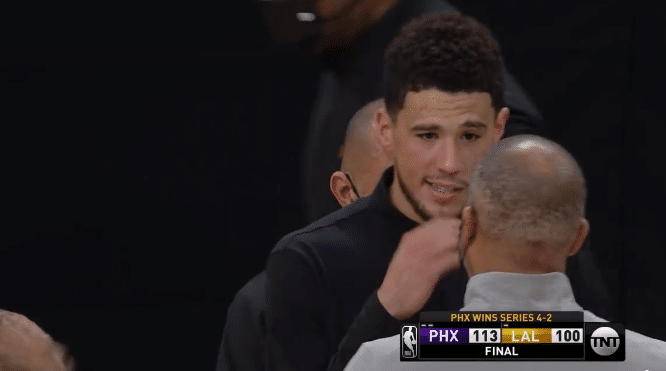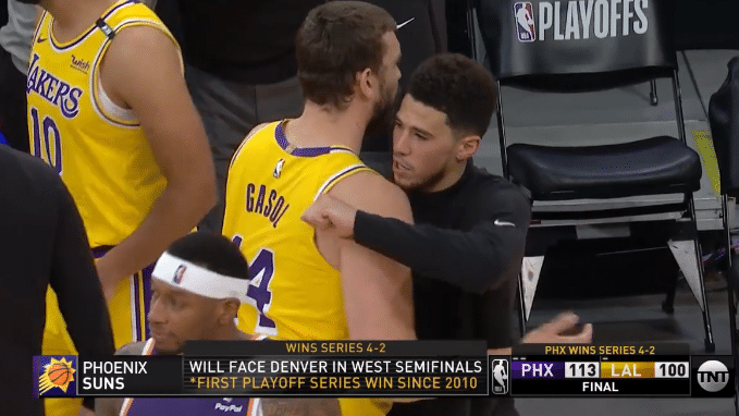 布克也和湖人球员们的拥抱,这一场比赛,砍下47分11个篮板的布克也是太阳赢球的最大功臣之一。比赛结束之后,布克也表示:“我整个职业生涯都在等待这一时刻,所以当它来到的时候,我不会畏缩不前。我为季后赛已经牺牲了很多,所以今晚我拼上了全部。”