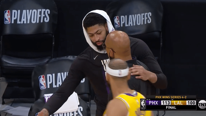 浓眉哥出战半节,赛后他上前恭喜太阳队晋级,和蒙蒂笑着一起说着什么。