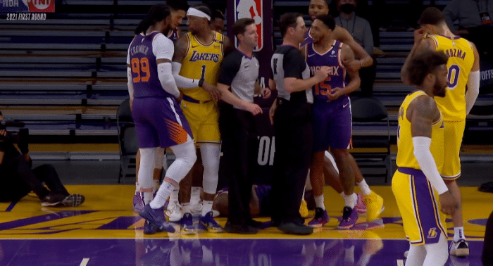来源:24直播网06-04 16:0824直播网讯讯 北京时间6月4日,太阳和湖人系列赛G6大战,浓眉带伤复出却仅打6分钟,腹股沟伤势明显变得有些加重,一瘸一拐沮丧离场,随后确定伤退;湖人又是半场溃不成军,半场还剩30.7秒,场上发生争议事件,波普吃到一级恶犯和技术犯规,克雷格和克劳德也吃T。