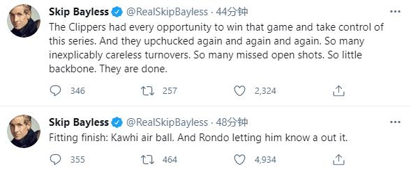 赛后“第一詹黑”Skip发推讽刺“快船本有无数机会可以赢下比赛,掌控系列赛。但他们一次又一次地弃之如敝履。多少次莫名其妙的失误?投丢多少次的大空位?没决心没毅力,船要沉了。”是啊,快船浪费了大好的机会,但是第三节他们突然崩盘了!