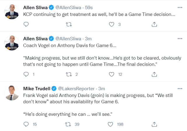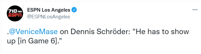 就算浓眉G6复出,对于一个带伤出战的人来说,你不可能要求他做到太多。ESPN名记Venice Mace指出:施罗德必须在G6有所表现。在G5的比赛中,施罗德发挥失常,9投0中一分未得,也是湖人遭遇30分惨败的重要原因。他需要站出来为詹眉分忧。