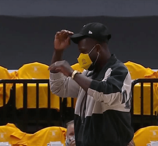 爵士小老板韦德现场观战,亲眼看着爵士4-1晋级分区半决赛;赛前韦德手痒,底角三分出手就中,手感还是很不错的;老板热身?韦德投进三分后把棒球帽戴正,球迷调侃韦德这波操作只能给9分。