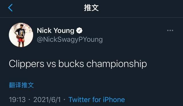 来源:24直播网06-02 16:4224直播网讯讯北京时间2021年6月2日星期三,前NBA球星尼克-杨在个人推特上预测了,本赛季总决赛的对阵:“今年争夺总冠军的两支球队将会是洛杉矶快船和密尔沃基雄鹿!”