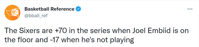 费城有多么依赖恩比德,Basketball Reference的这一数据说明了一切。这轮系列赛的前4场,恩比德在场时,费城赢了奇才70分,而恩比德不在场时,费城输给奇才17分。如果恩比德无缘出战G5,你们认为奇才能否再胜一场呢?