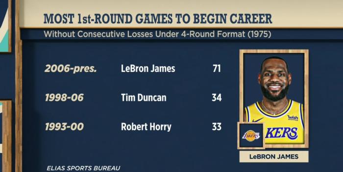 浓眉伤停,詹姆斯能延续季后赛生涯首轮从未连败的神迹吗?据统计,自从06年至今,詹姆斯已经在首轮打了71场比赛,从而遭遇连败的情况,这是NBA七局四胜制以来最长的纪录,排在第二的是邓肯首轮34场不连败,詹姆斯首轮71场从未连败太疯狂。