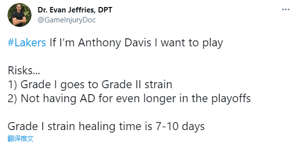 浓眉确实想带伤出战G5,可湖人拒绝让他带伤出战,医学专家列为浓眉带伤出战的风险——一级拉伤变成二级拉伤;浓眉将会缺席更久的季后赛;浓眉腹股沟一级拉伤的康复时间为7-10天。