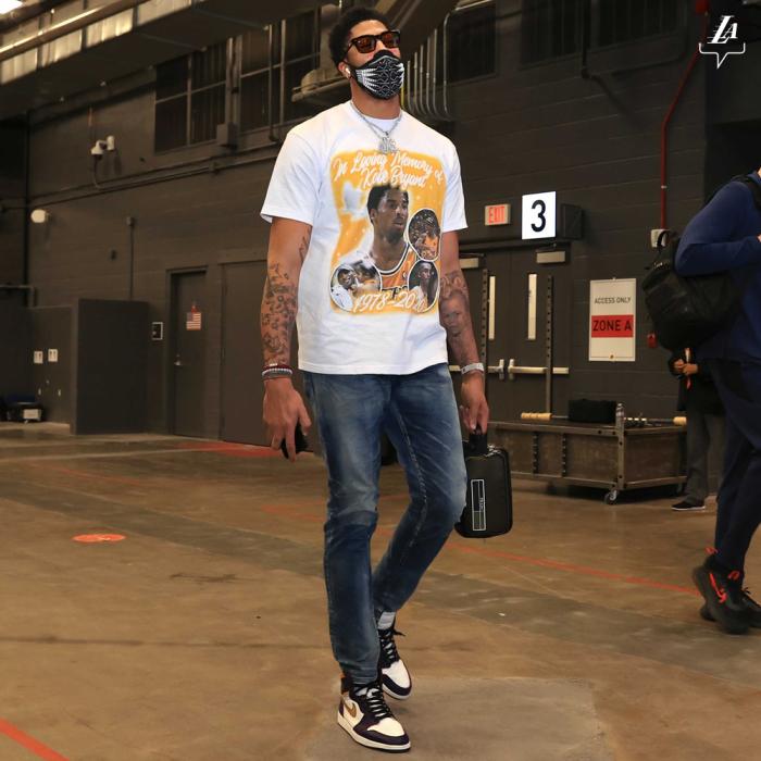 湖人官方晒出浓眉身穿印着科比头像的白色T恤入场照,发推写道:一生曼巴!