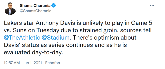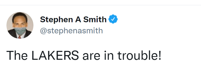 名嘴斯蒂芬-A-史密斯并不看好缺少浓眉的湖人,他在节目上表示:“戴维斯的腹股沟伤势看起来不是小问题,不确定他何时能够回归……他的缺阵让湖人除了詹姆斯外没有另外一个值得信赖的稳定得分点。我现在认为,如果戴维斯不能及时复出,湖人将会被太阳淘汰。”随后,史密斯转发了自己的节目视频,并配文写道:“湖人陷入困境了!”
