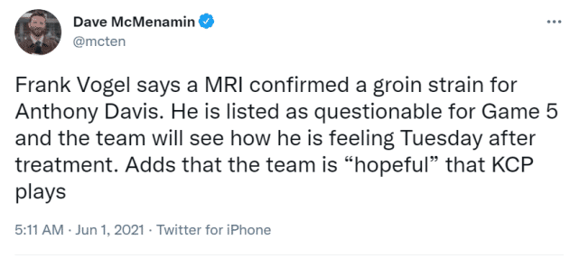 来源:24直播网06-01 15:1424直播网讯讯北京时间6月1日,湖人安排了一场训练,为明天的天王山之战做准备。训练过后,湖人主帅沃格尔接受了媒体采访,更新了安东尼-戴维斯的伤病状况。沃格尔表示,戴维斯已经接受了核磁共振检查,进一步确认了腹股沟拉伤的伤情。双方的第五战,戴维斯的状态将是questionable(出战成疑,上场概率50%),球队将看看明天他接受治疗后的感觉做出决定。目前他在每日观察名单上。