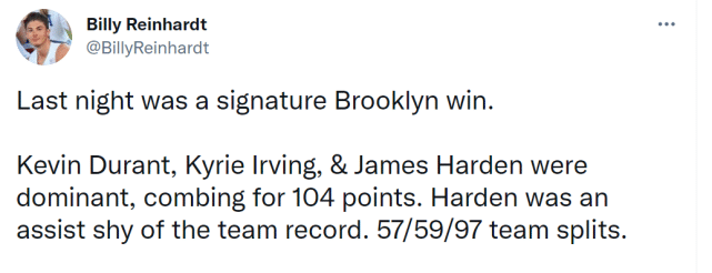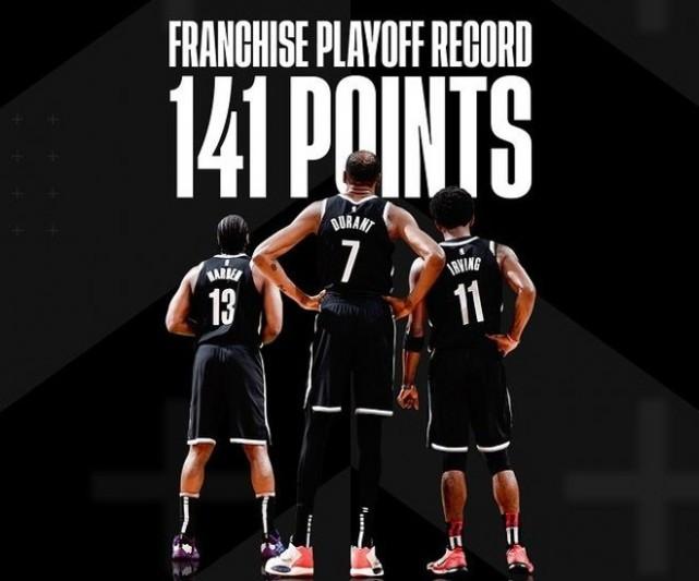 对于篮网来说,G4是一场疯狂的比赛,他们轰下141分,创造了季后赛队史得分纪录。篮网官方也晒出了一张三巨头背影的照片,并配上了这一成就。篮网记者Billy在社媒上写道:“昨晚是一场标志性的布鲁克林式胜利,杜兰特、欧文和哈登极具统治力,合力轰下104分,哈登距离队史纪录只差1次助攻,全队投篮命中率57%,三分命中率59%,罚球命中率97%。”