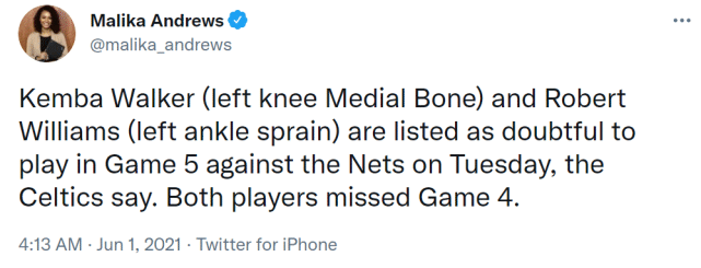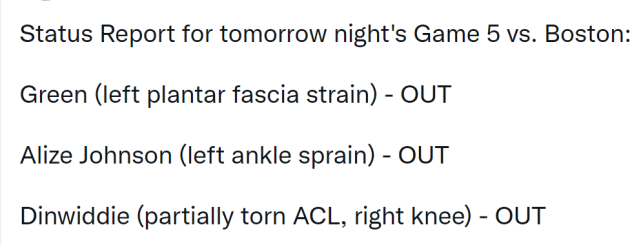 篮网官宣G5伤病名单!三名球员确定缺席,绿军两悍将大概率伤停