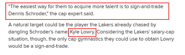 湖人用施罗德能够追逐的一个球星,是凯尔-洛瑞,考虑到湖人的工资帽状况,他们要想得到洛瑞,只能通过先签后换的方式。当然,这一操作方式需要施罗德的配合,施罗德未必愿意前往猛龙,因为之前他表示想要成为一支大市场球队的第一选择。这样来看,尼克斯有可能成为湖人的另一个交易选择。