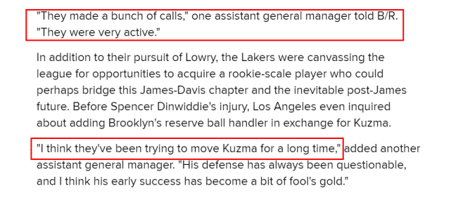 B/R还提到了湖人的另一个交易筹码,凯尔-库兹马。球队已经和库兹马续签3年3900万的合同,下赛季将是新合同的第一年。湖人曾试图在今年3月前送走库兹马,但最终没有成功。一支球队的副总经理透露,湖人当时打了一堆电话,在交易方面非常积极。另一个副总表示,很长一段时间内,湖人都在尝试送走库兹马,他的防守表现受到质疑,而且他早期的成功,让他的能力有点被高估了。