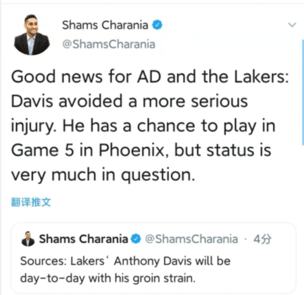 根据名记Shams报道,多名消息人士透露,浓眉哥被列入湖人每日观察名单中了,随后又跟进报道,浓眉避免了更严重的伤病,他有机会在G5登场,但出战状态是一个疑问。