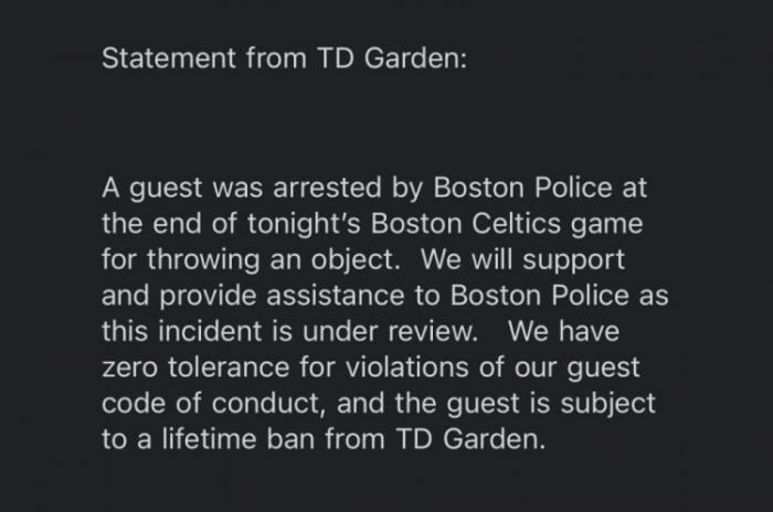 球员需要尊重,所以在事发后第一时间据名记Tim Bontemps报道,一位联盟消息源证实,向欧文扔水瓶的球迷,已经被逮捕。据名记Shams补充报道,这名球迷被终身禁赛在TD花园球馆观赛(banned for life)。TD花园之后也发布公告表示:“我们对于我们球迷的违规行为是零容忍的,这位球迷将被终身禁止在TD花园观赛。”