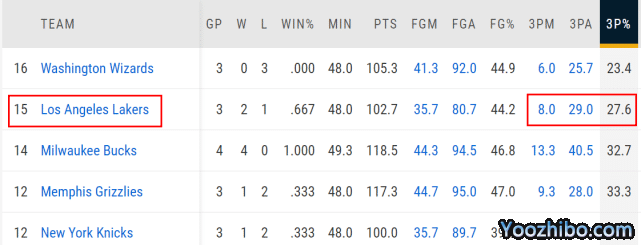 数据显示,湖人前3场比赛的三分球87投24中,命中率仅为27.6%,在所有16支季后赛球队中排名倒数第2。只有奇才的三分命中率(23.4%)比湖人更差。