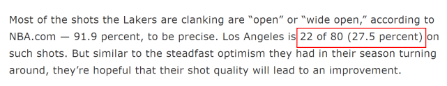湖人的三分不准,并不是因为太阳的防守有多么出色。The Athletic指出,湖人84次三分出手中,有80次是在空位(open)或者完全空位(wide open)的情况下。可是湖人射手没能把握这些空位机会,他们80次空位三分出手,只进了22个球,命中率低至27.5%。