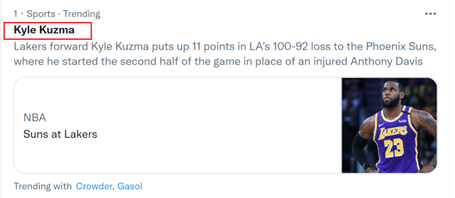 浓眉受伤后,库兹马很快冲上全美热搜的第一位。原因很简单,浓眉不能打,库兹马将在攻防两端承担更多的责任。这场比赛的下半场,他顶替了浓眉的位置,整场比赛,库兹马打了25分钟,11投4中,三分5投1中,得到11分4篮板2助攻,但个人正负值只有-13,他在场时,湖人输给太阳13分。