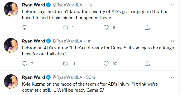 赛后,库兹马接受采访,谈到了浓眉受伤后全队的心态。“我认为我们依然保持乐观,我们会为第五场做好准备。”詹姆斯赛后也谈到浓眉的伤病,他说:“如果浓眉没有做好准备打第五场比赛,对于我们球队来说,这将是一次沉重的打击。”詹姆斯表示浓眉受伤后,他还没和浓眉进行过交流, 也不知道伤病的严重程度。