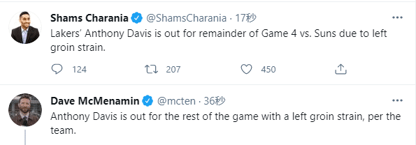 上半场快结束时,浓眉在一次上篮时不幸摔倒,当时浓眉捂着大腿内侧,躺在地板上十分痛苦,虽然他忍痛站起来,但一瘸一拐明显受限,走回更衣室途中,浓眉仍旧一瘸一拐;下半场浓眉没有首发上场(库兹马顶替其首发出战),也没有坐回替补席,而是留在更衣室接受检查。