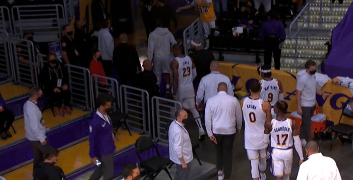末节詹姆斯单核带队疯狂反扑,连突带罚不断得分,克劳德抱人犯规惹怒老詹,后者十分不满判罚;关键追分时刻,小加索尔和卡鲁索输送三分火力,湖人追到7分;最后2分钟,小加传球失误,施罗德上篮不中,分差来到10分。