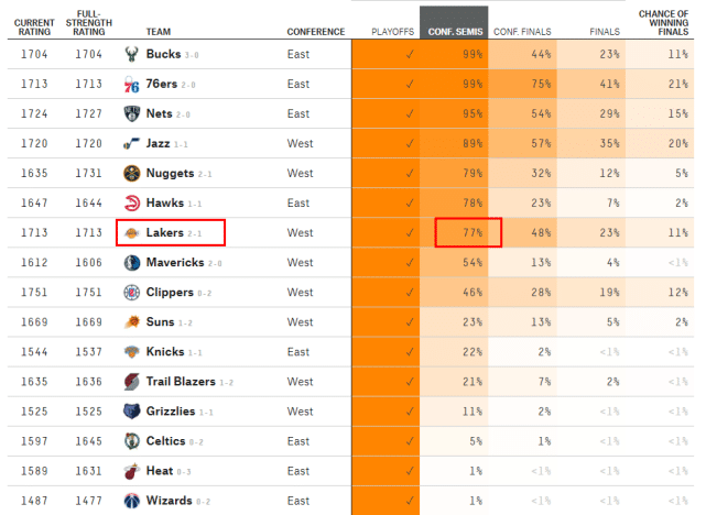 季后赛最新晋级概率出炉!湖人77%淘汰太阳 东部三强已经稳了?