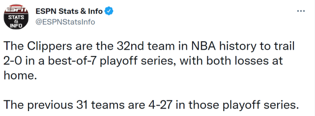 本赛季常规赛,快船队的三分命中率41.1%,排名联盟第一,而季后赛至今两场比赛,快船队的三分命中率只有32.9%,排在16支季后赛球队的第13位。专家Bobby Karalla指出,三分球是快船输掉前两场比赛的重要原因。