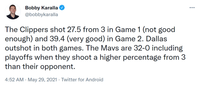 “快船第一场的三分命中率只有27.5%,显然不够好,而第二场的三分命中率达到39.4%,算是很出色了,但两场比赛,独行侠的三分命中率都胜过快船。数据显示,”本赛季(包括季后赛)独行侠三分命中率超过对手的32场比赛,他们全部获胜。