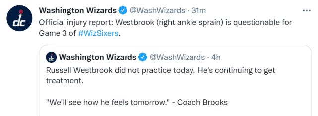 如果威少不能上场,奇才的前景将更不被看好。数据网站FiveThirtyEight认为,0-2落后的奇才只有1%的晋级概率。论整体实力,他们也确实不是费城的对手。