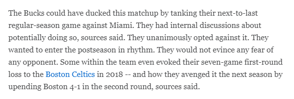 其实,雄鹿本可以在首轮避开热火,但他们拒绝摆烂;据名记洛维报道,雄鹿本可以在倒数第二场常规赛故意输球从而避免首轮对阵热火;雄鹿内部严肃讨论了这件事,最终雄鹿内部一致决定拒绝摆烂,因为他们想带着赢球的节奏进入季后赛。