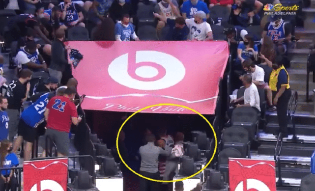 在工作人员的搀扶下,威少返回球员通道准备回更衣室接受治疗,此时意外发生了,场边的费城观众和威少喷起了垃圾话,激烈的垃圾话让这个球迷情绪有些失控,直接将手中的爆米花向威少扔去。