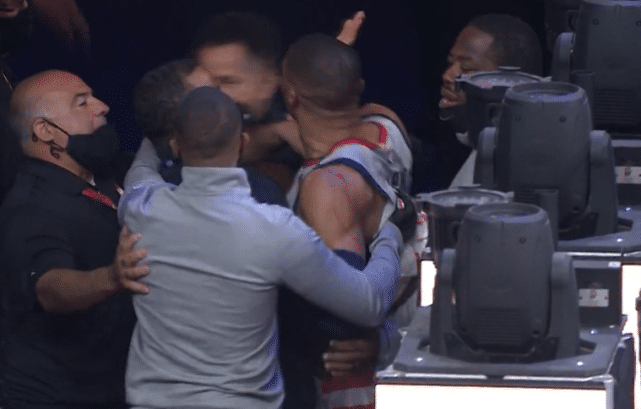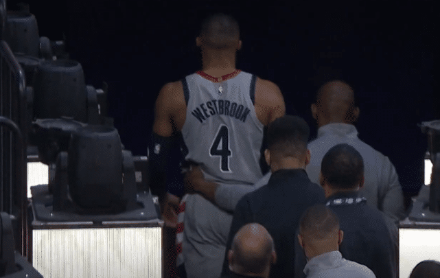 来源:24直播网05-27 11:2024直播网讯讯 北京时间5月27日,奇才客场95-120不敌费城,威少末节脚踝受伤退场,在离开球场前,有球迷把爆米花扔到威少头上,威少想要冲回球场和球迷理论,但被工作人员拦下。随后,这位球迷被驱逐出场。