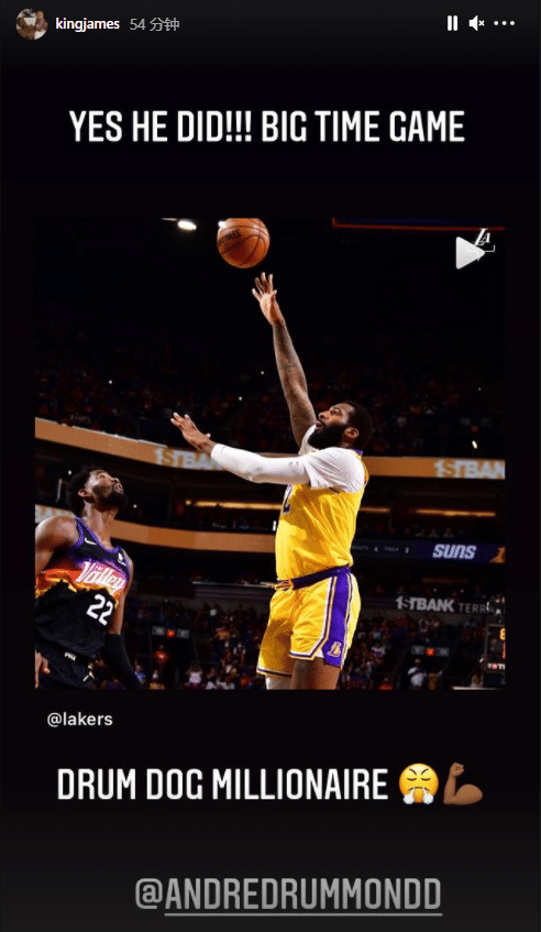 詹姆斯转发庄神G2集锦,为队友疯狂打CALL,配文写道:YES,他做到了,巨大的胜利;德拉蒙德兄弟,大富豪(DRUM DOG MILLIONAIRE)。