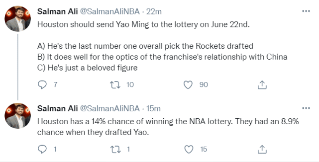 Ali在社媒上写道:“休斯顿应该请姚明参加6月22日(当地时间)的抽签仪式。A.他是火箭上一个选中的状元秀。B.这有助于改善球队和中国之间的关系。C.他是一个大家都喜欢的球员。”Ali还表示,火箭这次有14%的概率抽到状元签,而当年他们在只有8.9%的概率下抽到了状元签,并选择了姚明。