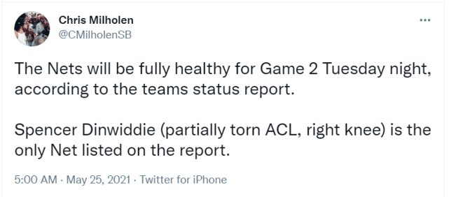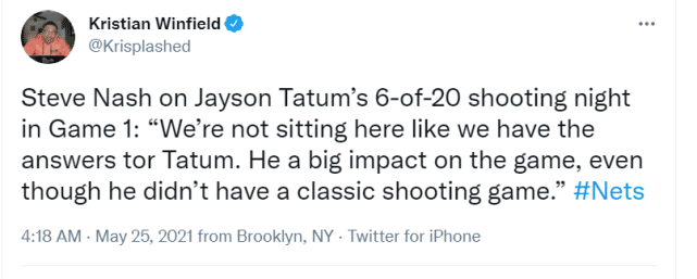 好消息是篮网继续保持健康的状态,最新伤病报告上,只有丁威迪一人确定缺席系列赛第二场。纳什谈到对手时,特别提到了塔图姆,上一场比赛,这位绿军球星只有20中6的投篮表现。“我们不会坐在这儿就像是我们已经找到了对付塔图姆的答案,”纳什说道,“他对比赛有巨大的影响力,即便他在比赛中的投篮表现没有那么出色。”