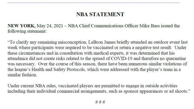 但是事情真的是如此吗?联盟真的是双标吗?5月25日,NBA官方声明给出了最准确的答案。为什么詹姆斯没有被处罚呢?最主要的原因是詹姆斯所参加的这个活动,参与者要求必须是接种过疫苗或者检查结果是阴性的,也是因为这一点,联盟和专家进行过讨论后,认为詹姆斯在这样的环境中是安全的,而且NBA也允许接种疫苗的球员从事包括个人商业活动在内的户外活动,这也是詹姆斯最终没有被隔离或者禁赛的主要原因。