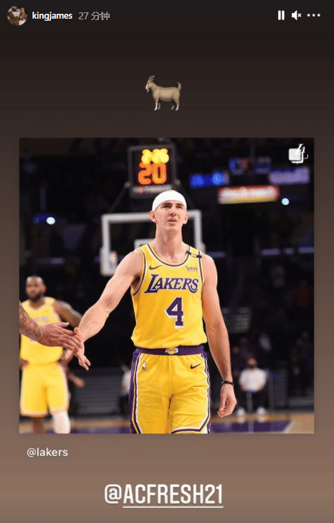 詹姆斯转发卡鲁索在附加赛中的攻防表现,配上山羊的表情,盛赞小弟是历史最佳。