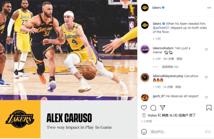 晋级功臣!湖人官方盛赞卡鲁索攻防兼备,詹皇狂吹小弟:历史最佳
