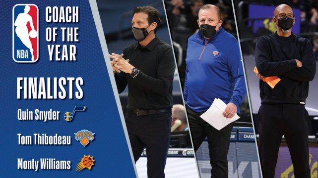 最佳主教练奖的3位候选人是爵士的斯奈德、尼克斯的锡伯杜和太阳的蒙蒂-威廉姆斯。
