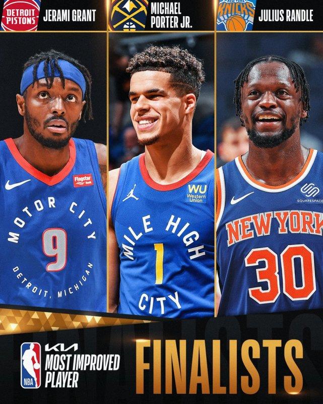 进步最快球员奖的3位候选人是活塞的格兰特、掘金的小波特和尼克斯的兰德尔。