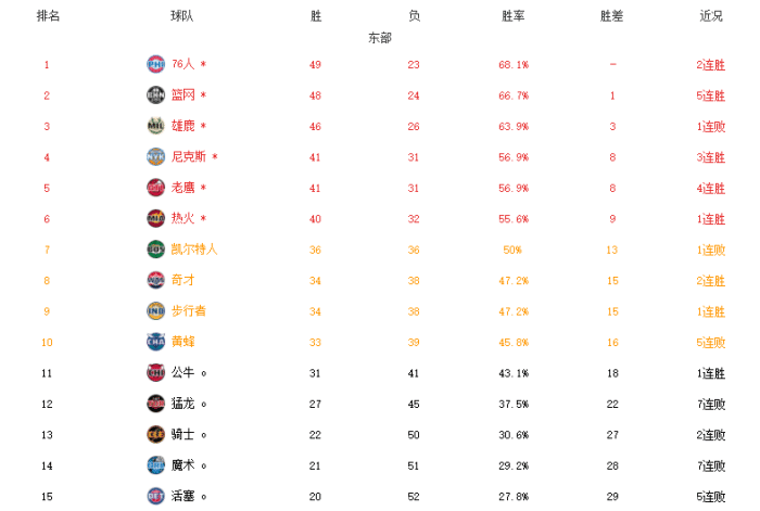 东部第1-4名:费城、篮网、雄鹿、尼克斯;
