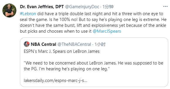 难道詹姆斯脚踝伤势加重吗?医学专家Evan Jeffries发推写道:昨晚詹姆斯拿到三双,用一只眼睛投进制胜三分球,他还没有100%康复,不过说他单腿打球太极端,只是由于脚踝的原因,他没有打出爆发力。