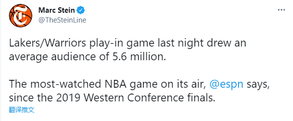 来源:24直播网05-21 10:4924直播网讯讯 北京时间5月21日,湖人和勇士全美直播收视率出炉,据名记Marc Stein报道,湖人对阵勇士附加赛的平均收视人数为560万人,此数字为19年西决之后最高平均收视,这也是本赛季平均收视最高的一场比赛,詹姆斯和库里两大巨星保证了收视率。