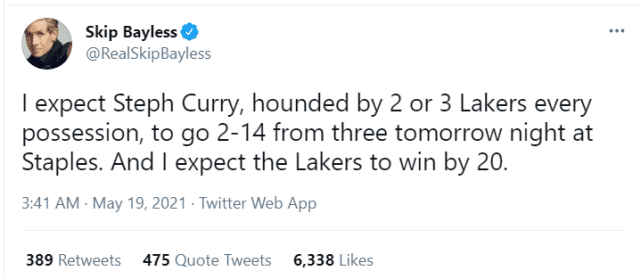 贝勒斯在节目上表示,湖人大概能以119-99这样的比分来赢下这场比赛。“这个赛季对阵库里,湖人做了什么?他们的防守是最棒的。顺便说一下,他们的防守效率是联盟第一。他们的三分不好,罚球不好,但没关系,他们有防守。”