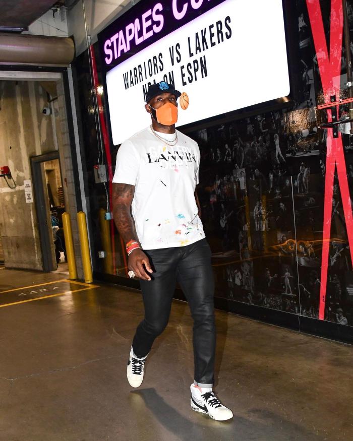詹姆斯身穿一件扎染的白色T恤,搭配黑色紧身裤和白色运动鞋,还戴着黑色棒球帽,貌似戴着一枚总冠军戒指;走在球馆通道里,詹姆斯眼神十分专注。