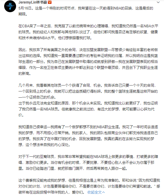 来源:24直播网05-19 14:5324直播网讯讯 今天林书豪在社交媒体上发布长文,称本赛季重返NBA的梦想已经破灭了,按照联盟的规定,常规赛结束、季后赛开始前还没有签约,就正式无缘本赛季的NBA了。对于林书豪来说,在发展联盟打了一个赛季,场均19.8分位居第7名,得分榜前11名中只有他没有得到NBA的合同,在长文中林书豪也表示了不理解,他只是想要一份10天的短约,但即便是这样的要求,依旧无法得到满足。