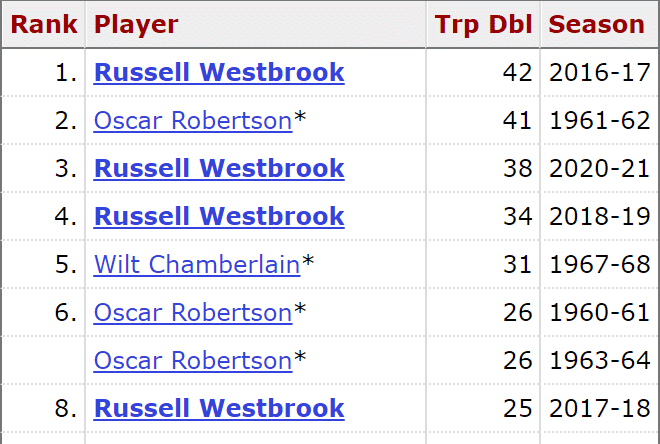 此外,单赛季38次三双,也创下威少生涯单季第二高纪录,最多的是16-17赛季他拿到MVP的赛季。而38次三双,可以排名NBA历史单赛季第三位,仅次于威少自己和大O罗伯特森。不过,这个赛季NBA只有72场比赛,而当时则是82场。因此,这个赛季威少在拿三双的效率上,还要超过MVP赛季。此外,18-19赛季威少也拿到过34次三双。